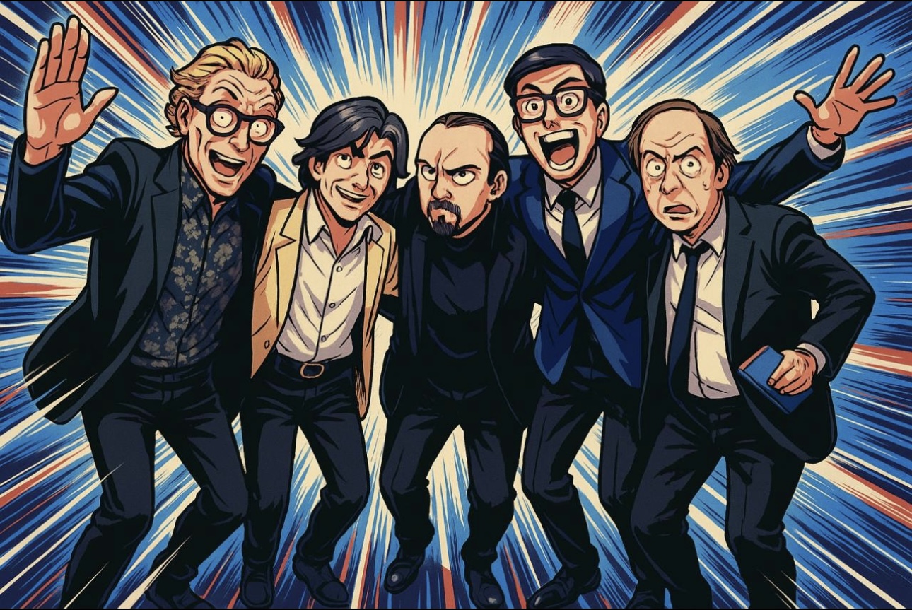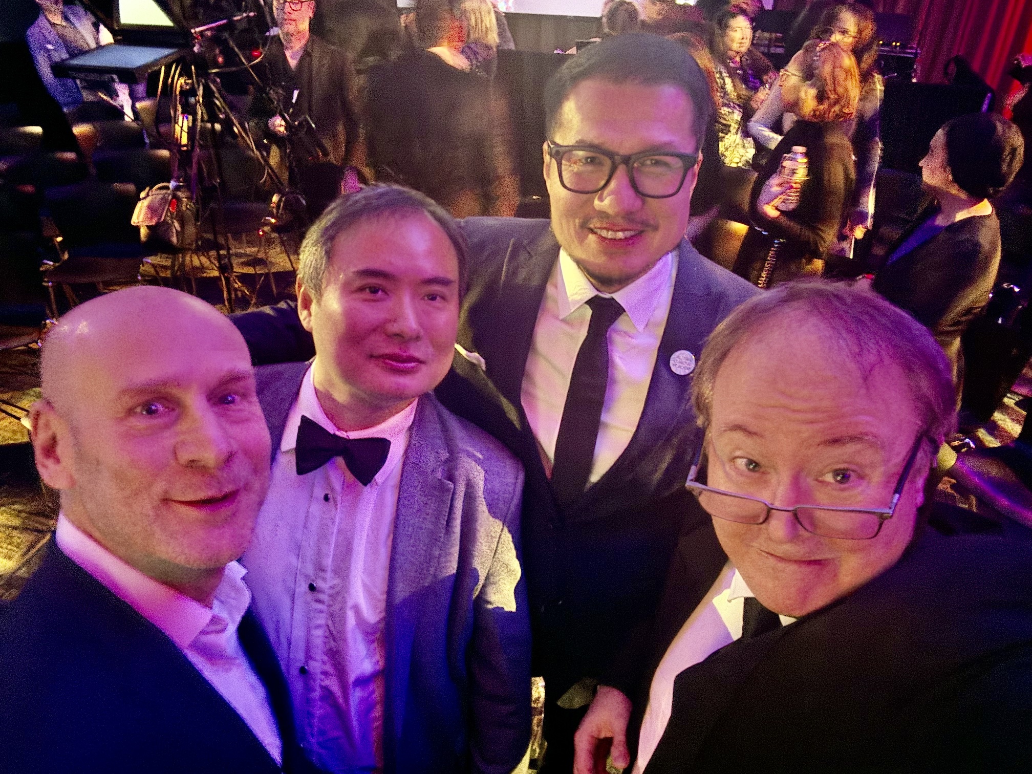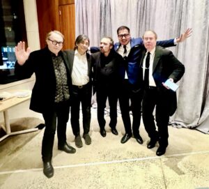 Michael Owen, Dario Loverde, Alex Coulombe, Alvin Graylin, and Chris Pfaff, after the Polys (and Alex Coulombe’s cartoon treatment)